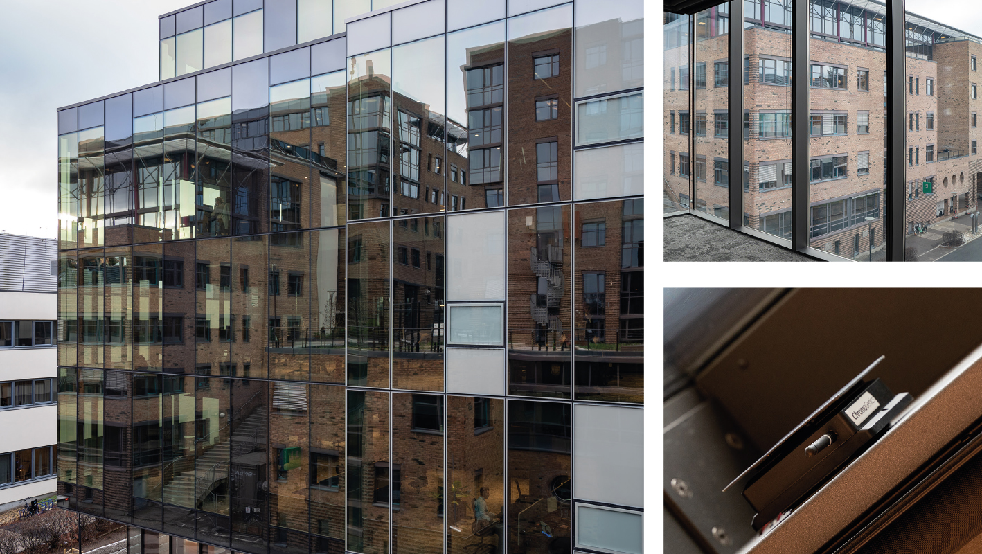 Es fügt sich in die Fassade des Gebäudes ein und gewährleistet die freie Sicht von innen nach außen.
