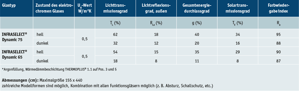 INFRASELECT® Dynamic beruht auf Basis von ConverLight® Dynamic, einer elektrochromen Technologie des schwedischen Unternehmens ChromoGenics. Mit diesem Glas wird der Licht- und Energieeintrag ins Gebäude automatisch angepasst und optimiert. Es reagiert eigenständig auf die sich verändernden Wetterbedingungen im Tages- und Jahresverlauf. INFRASELECT® Dynamic reduziert den solaren Wärmedurchlass um bis zu 90 %, wodurch ein effektiver Sonnenschutz gewährleistet wird. Gleichzeitig sinkt der Bedarf an Klimatisierung deutlich. Je nach Glasaufbau variiert der Lichtdurchlass zwischen 62 % und 18 %, wobei Sichtkomfort und Transparenz stets erhalten bleiben.