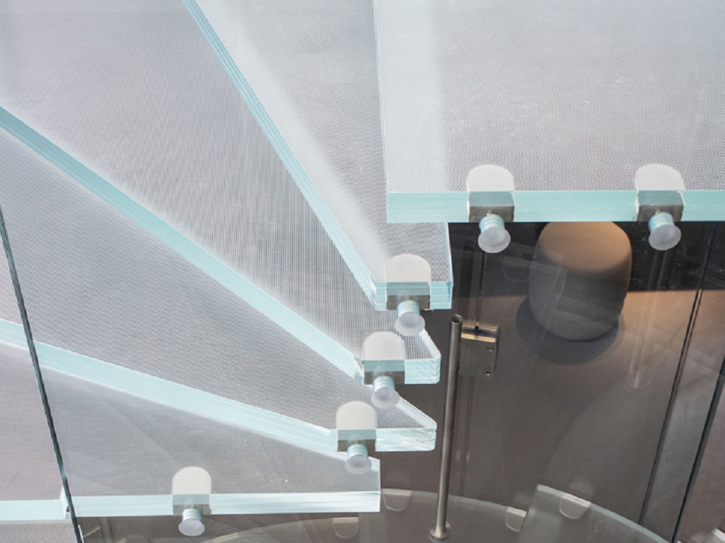 Doch begehbares Glas ist nicht nur eine Frage des Designs – es muss auch höchsten technischen Anforderungen gerecht werden. Besonders wichtig sind Aspekte wie Tragfähigkeit, Rutschhemmung und Sicherheit. Die Glastreppe im Somium Head Office erfüllt diese Anforderungen durch die Verwendung von Verbund-Sicherheitsglas (VSG). Verbundsicherheitsglas besteht aus mindestens drei Scheiben: zwei Tragscheiben aus robustem Floatglas oder teilvorgespanntem Glas (TVG) und einer Deckscheibe aus Einscheiben-Sicherheitsglas (ESG). Diese Struktur sorgt für eine hohe Belastbarkeit und Sicherheit, selbst bei intensiver Nutzung.