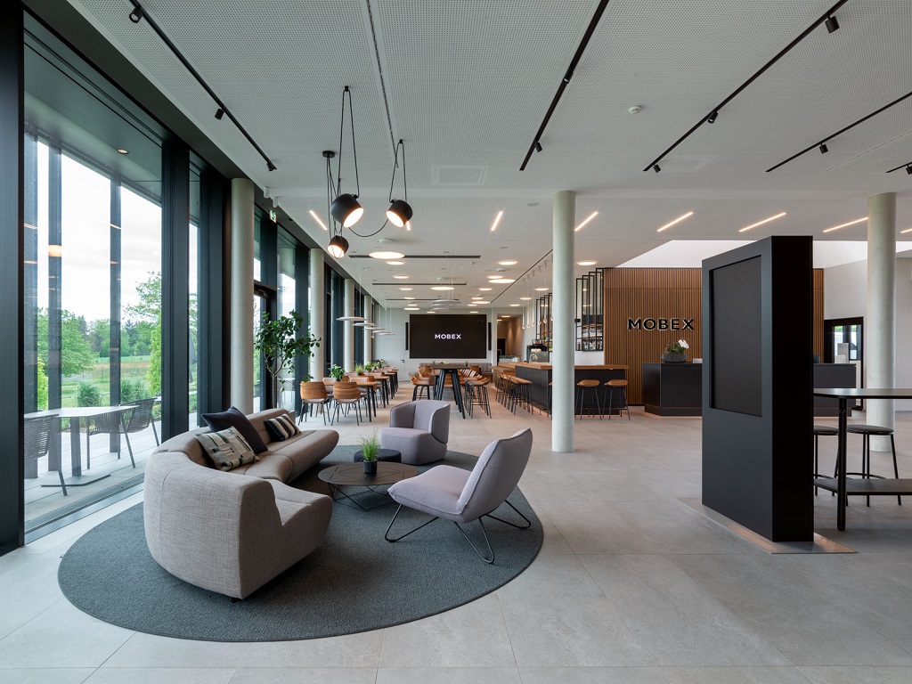 Die großzügigen Glasflächen im Bürogebäude von MOBEX sind nicht nur optisch ansprechend, sondern erfüllen auch funktionale Anforderungen. Der 27 Meter hohe Turm mit seinen sechs Etagen beherbergt offene Büroflächen, die flexible Arbeitsweisen und eine starke Kommunikation fördern. Das innovative Raumkonzept setzt auf Akustiklösungen und Ruhezonen, um eine angenehme Arbeitsatmosphäre zu schaffen.